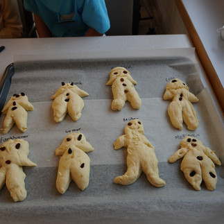 Mit strahlenden Gesichtern und kreativen Ideen machten sich alle ans Werk: Arme, Beine, Augen, Nase und Mund – kein Detail durfte fehlen! Mit Mandelsplitter, Rosinen und vielem mehr wurden die Grittibänz liebevoll dekoriert. Damit nach dem Backen kein Grittibänz verwechselt wird, wurde jedes Kunstwerk mit Namen versehen.